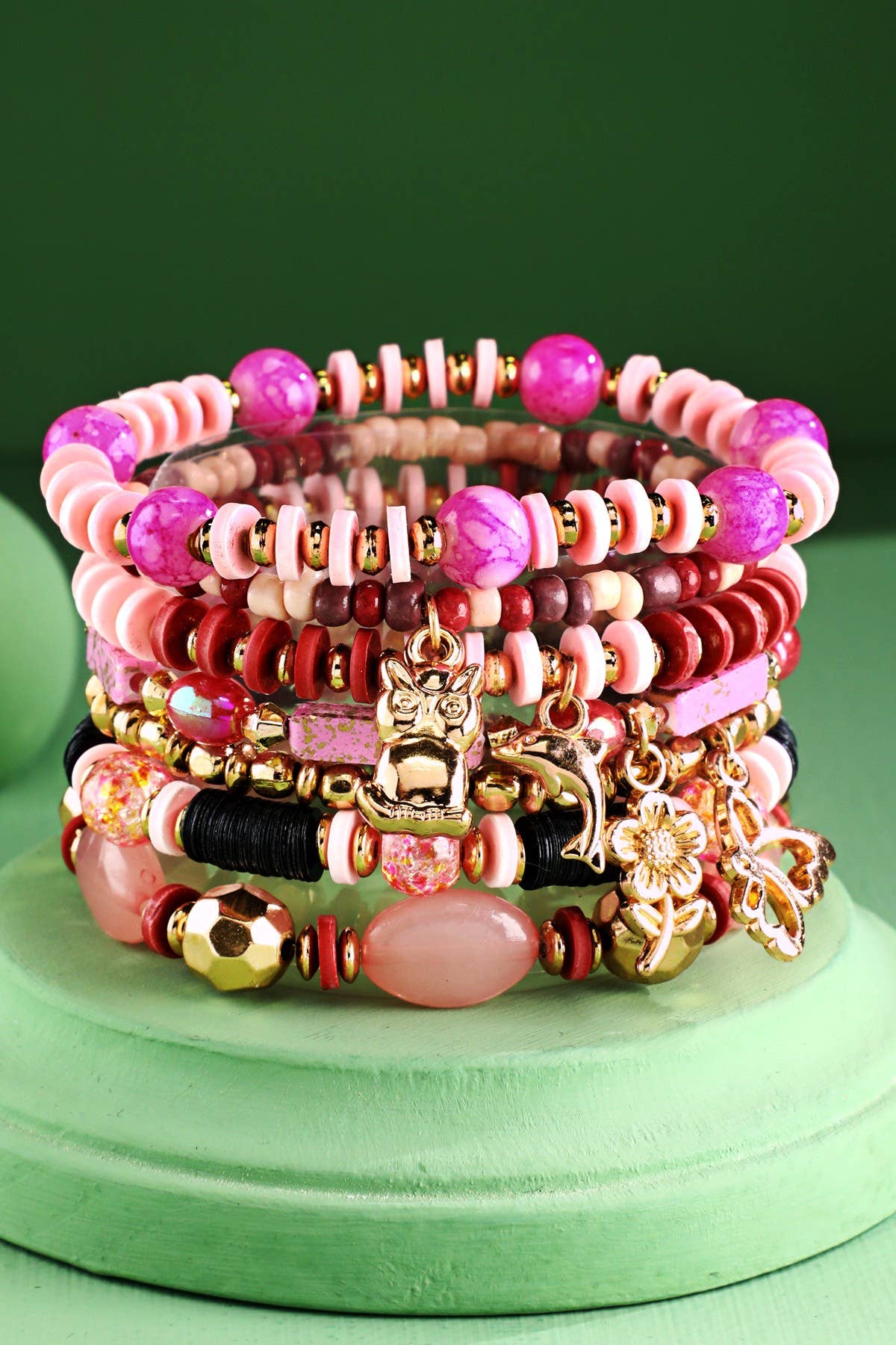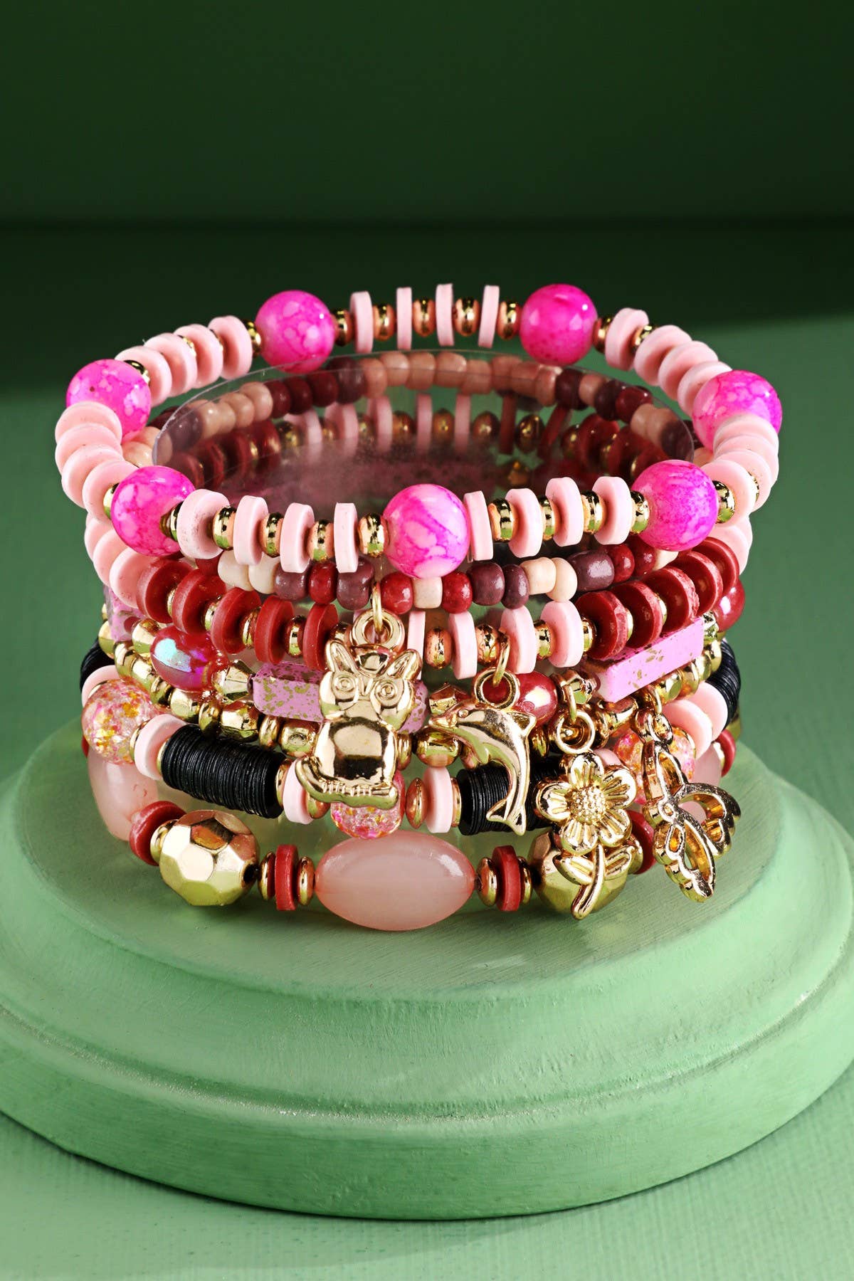 Playful disk bead stretch bracelet with glass beads and metal accents