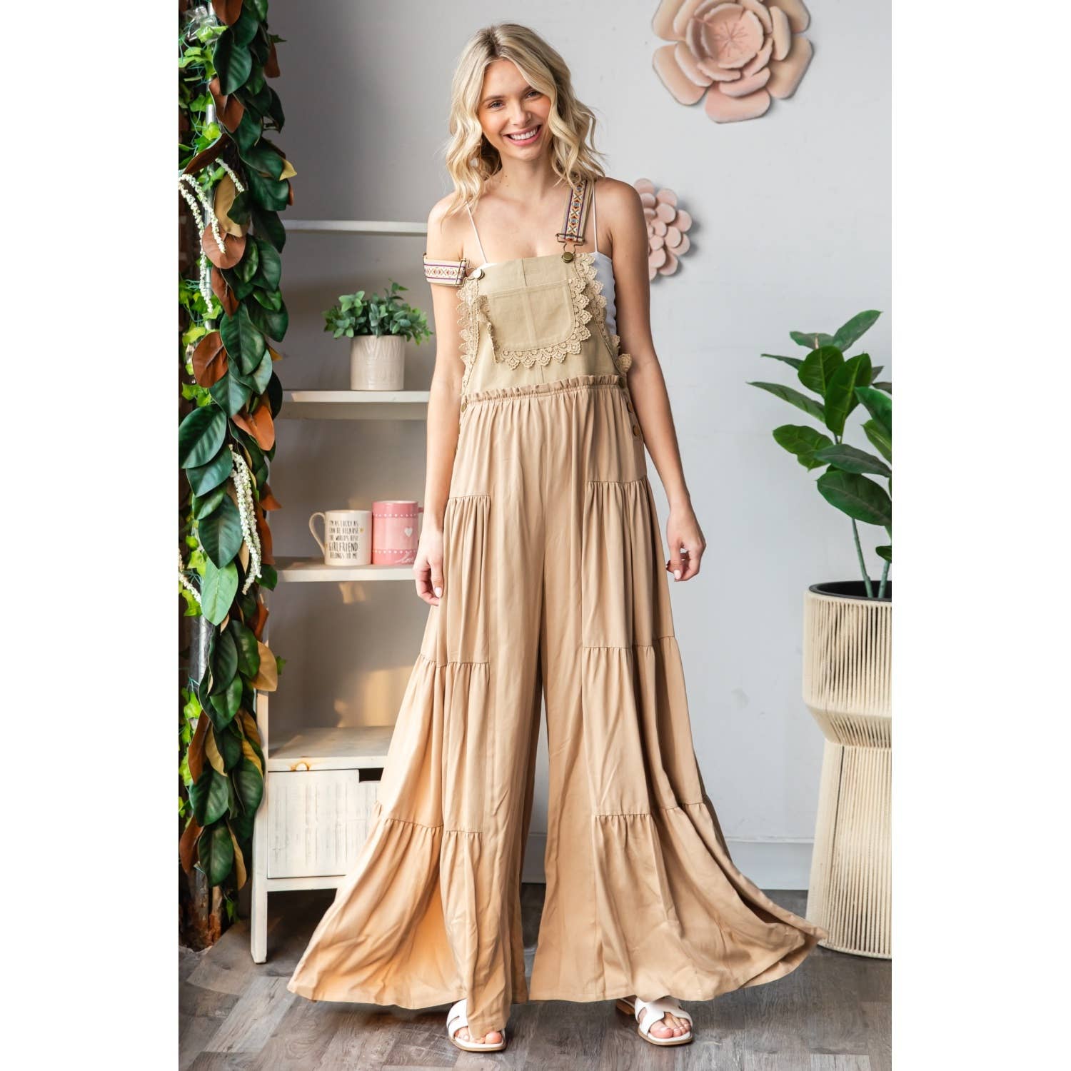 Introducing Veveret's Embroidered Strap Flowy Jumpsuit. This women's jumpsuit, crafted from 100% cotton with contrasting 100% rayon straps, offers a unique style for any occasion. The embroidered straps add a trendy touch to this chic outfit. Quality, affordability, and style are woven into every piece we create. Enjoy the best of LA fashion with Veveret.